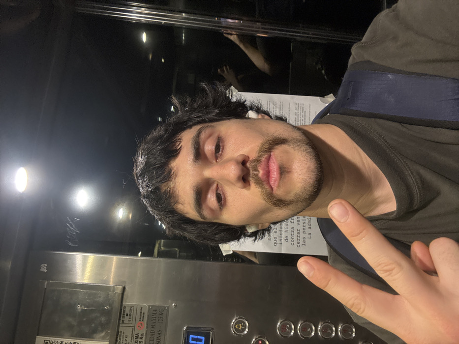 A man takes a selfie in an elevator. He has dark hair, a mustache, and a goatee. He wears a dark t-shirt and a blue backpack. He holds up a hand making a peace sign. Elevator buttons are visible in the bottom right. A metal service panel is to his left. A sign above the panel reads "DE SERVICIO" and gives some additional details and safety regulations. The interior of the elevator is dark.