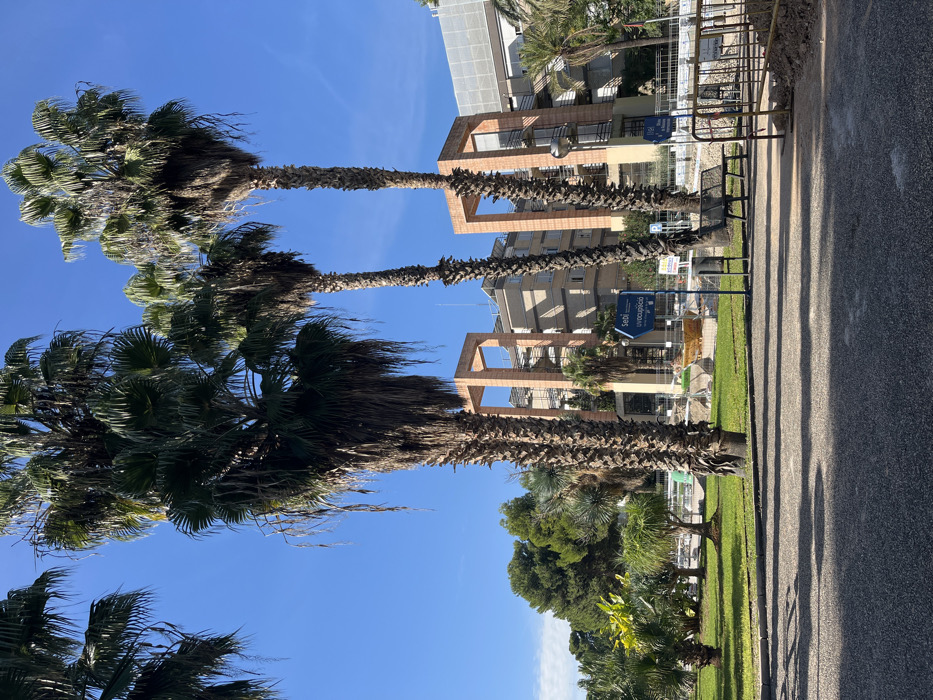 This image depicts an outdoor environment within the city of Paterna, Spain, likely near the University of Valencia Science Park. The foreground features a dark, granular ground surface exhibiting elongated shadows, indicating sunlight from the left. Beyond this, a manicured green lawn extends into the mid-ground. Several tall palm trees with textured trunks and dense green fronds dominate the scene, with some fronds appearing desiccated. In the mid-ground, multi-story modern buildings are visible, characterized by prominent reddish-brown structural elements forming large, open archways. A taller, lighter-colored building stands behind these structures. Objects include a blue directional sign with white text, reading "SEDI" and "uvocupació," pointing left. A similar blue sign is partially visible on the right. A dark metal slatted bench and a black cylindrical waste bin are positioned on the right side of the lawn. A light-colored, decorative or structural element is also present on the lawn. On the far right, yellow construction barriers and disturbed earth indicate an area of ongoing work. No individuals are present, and no actions or interactions are depicted within the scene.