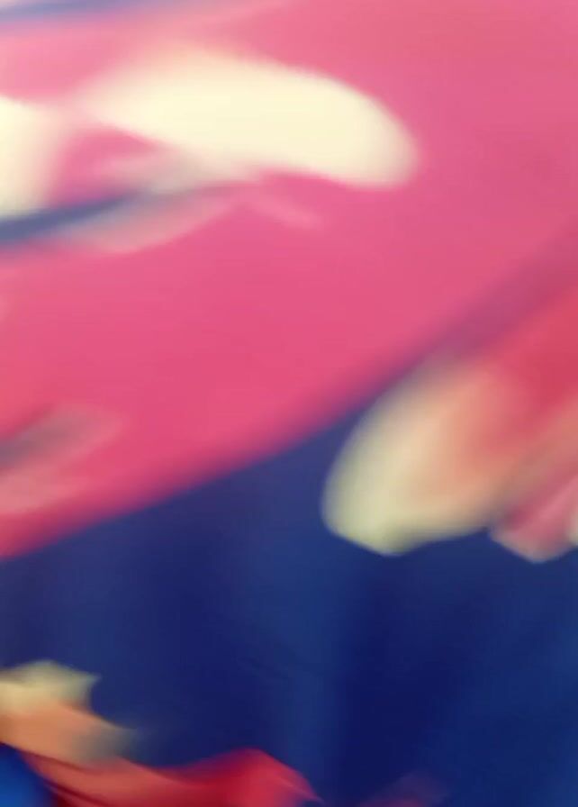 The video starts with a close-up of patterned fabric with red, yellow, orange, and black colors, and a butterfly wing design. The camera quickly moves and shows a person wearing a blue and red soccer jersey and tan pants crouching on the ground, though the image is blurry. A portion of the patterned fabric remains in view.