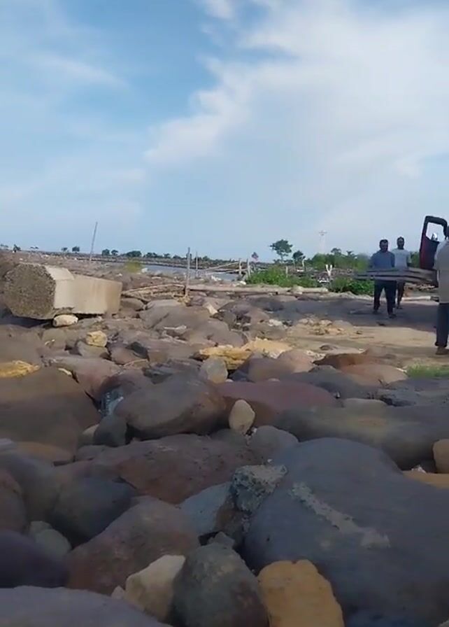 The scene is a rocky beach with a partly cloudy blue sky. A group of men are unloading wooden planks from the back of a red and green truck. Several blue plastic chairs and a table are near the truck. The foreground is dominated by large rocks of varying sizes and colors.