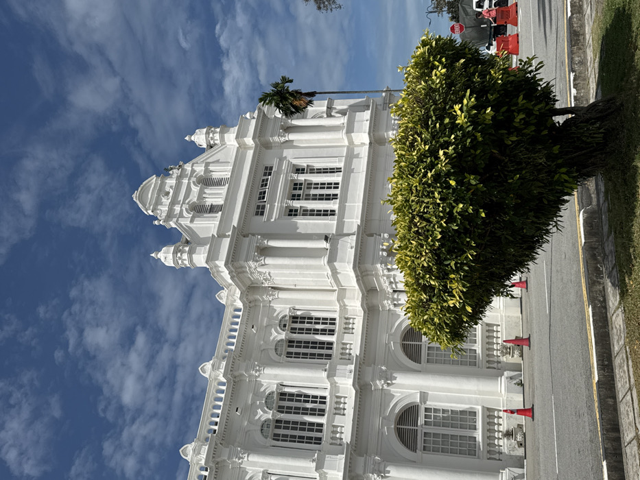 A white, ornate building with many windows stands against a blue sky with wispy clouds. The building's architecture features columns, arched windows, and decorative elements. A leafy green tree partially obscures the building on the right side. The image is oriented sideways. There are also several orange traffic cones and a stop sign visible in the image.