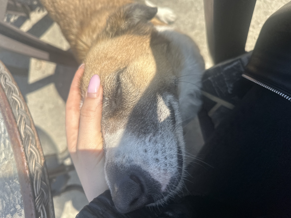 A close-up, high-angle perspective captures a human-animal interaction outdoors in Semchinovo, Bulgaria. The central subject is a medium-sized dog with short, light brown and white fur, specifically its head, muzzle, and a portion of its back. The dog's eyes are closed, and its snout is visible towards the lower left. A light-skinned human hand, featuring light pink manicured fingernails, is positioned gently on the dog's forehead, indicating a petting action. The human subject is wearing a dark garment, potentially a jacket, with a silver zipper visible in the lower left portion of the image. In the background, to the upper right, a segment of dark, braided outdoor furniture, possibly a table leg, is visible. The ground surface appears to be a light-colored, paved material, illuminated by direct sunlight, which casts distinct shadows.