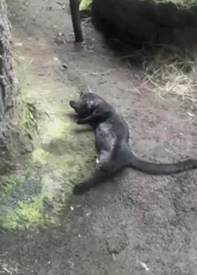 black otter lying on its back on a dirt surface in what appears to be an enclosure at a zoo or wildlife center. The otter is mostly black but has some patches of light-colored fur on its underside. It is using its paws to groom its face and neck. The ground is a mix of dirt, small rocks, and some straw. There are some rocks and a small tree branch nearby, with moss visible on the rocks. The video is taken from behind a glass barrier. There is the faint sound of voices in the background.