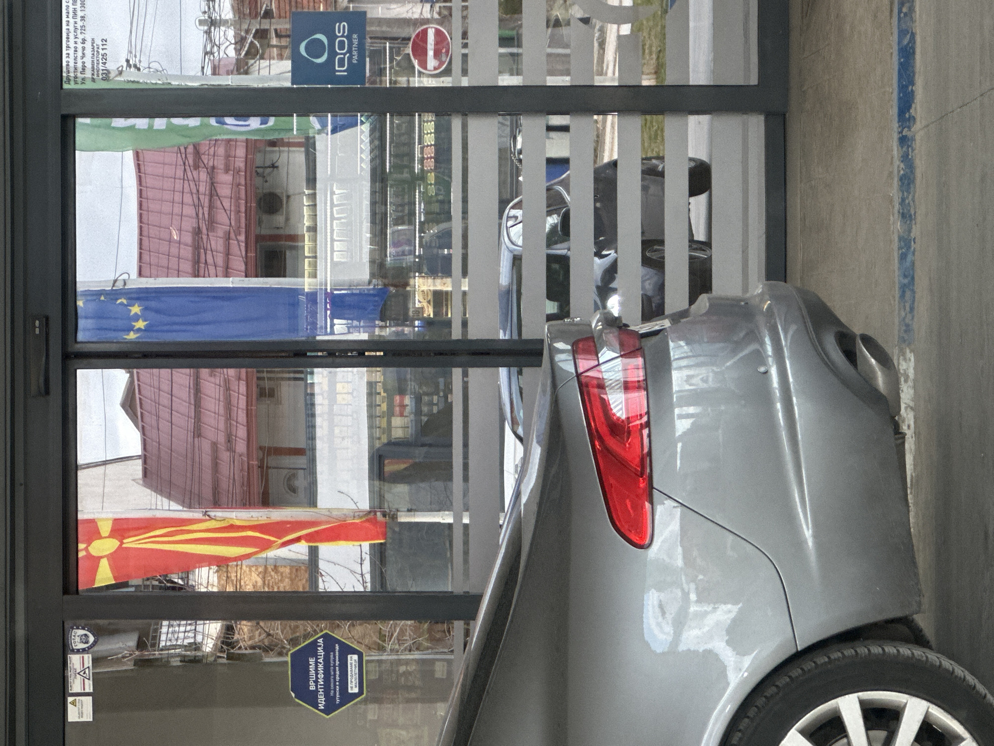 The image displays an exterior, eye-level view of a commercial entrance in Kumanovo, North Macedonia, during daylight hours. In the left foreground, the rear section of a grey sedan is parked on an asphalt or concrete surface, featuring its left taillight, bumper with a parking sensor, and a single exhaust pipe. A faded blue line is painted on the ground. The central and right portions of the image are occupied by dark grey-framed glass entrance doors. Reflected and visible through the glass are three vertical flags: the red and yellow flag of North Macedonia on the left, the blue flag with yellow stars of the European Union in the center, and a partially visible green flag on the right. Affixed to the glass are several signs: a blue hexagonal sign in Cyrillic, stating "ВРШИМЕ ИДЕНТИФИКАЦИЈА" (We perform identification) for tobacco and related products, and "НЕ ПРОДАВАМЕ НА МАЛОЛЕТНИЦИ" (We do not sell to minors); a white rectangular sign with business details including "УЛ. Перо Чичо бр. 725-38, 1300" and a phone number "031/425 112"; a blue "IQOS PARTNER" sign; and a red circular prohibitory sign. Reflections in the glass prominently show a building across the street with a reddish-brown tiled roof, white facade, and an external air conditioning unit. Another grey vehicle is reflected further back. Faintly visible through the lower sections of the glass doors are horizontally striped obscuring elements and shelves stocked with products inside the establishment. The background beyond the reflections reveals bare tree branches, utility poles with power lines, and distant structures. No individuals are present in the scene.