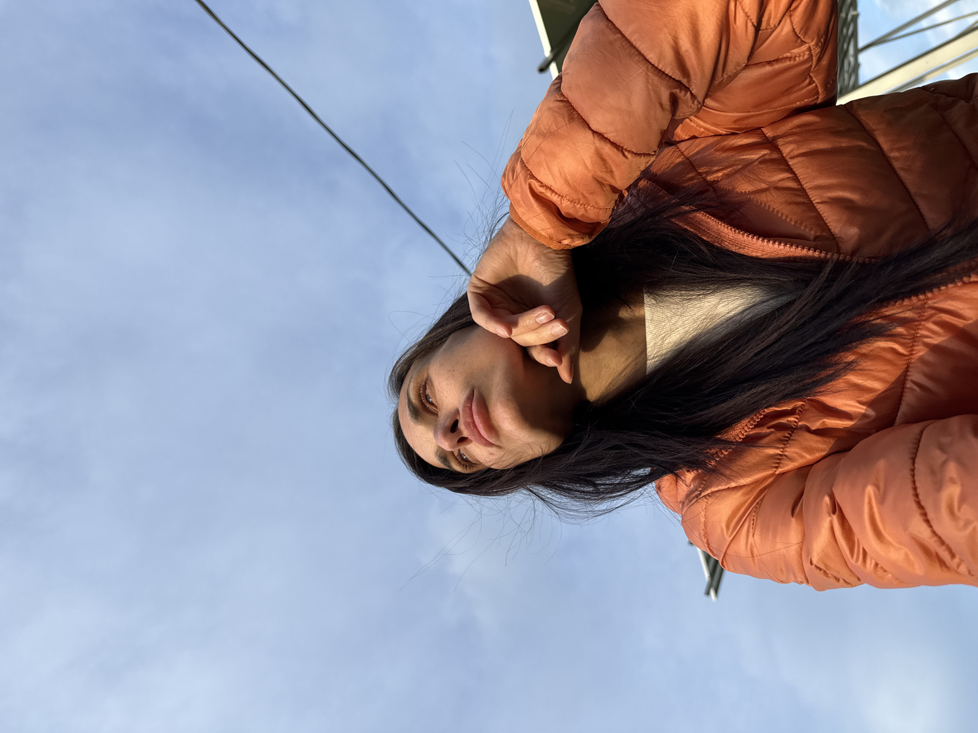 A low-angle, medium shot depicts a young woman against a pale blue sky. She wears a quilted orange jacket, her dark hair falling around her face. Her right hand is raised near her cheek, fingers touching her face. An electrical wire is visible in the top left corner of the frame. The location is Obnova, Bulgaria.