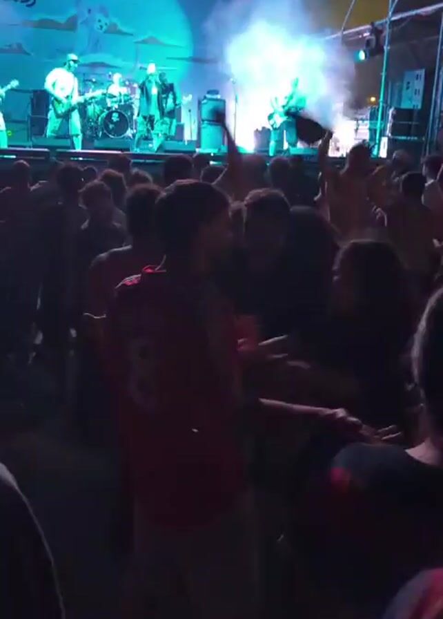 A band performs on a stage under bright blue and white lights in front of a large crowd at night. A large blue banner reading "INDNEGEV 2025" hangs behind the band. The crowd is a dense mass of people, some jumping and raising their arms in the air. Smoke billows from the stage, partially obscuring the band. The band consists of multiple members playing guitars and drums. The setting appears to be an outdoor music festival.