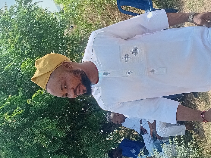 A man with a beard and tan cap stands outside in a white robe with ornate decoration. He is positioned to the left side, with trees and greenery filling the space behind him. In the distance, several people sit together in blue and white garments. A blue plastic chair peeks in the frame in the top right corner.