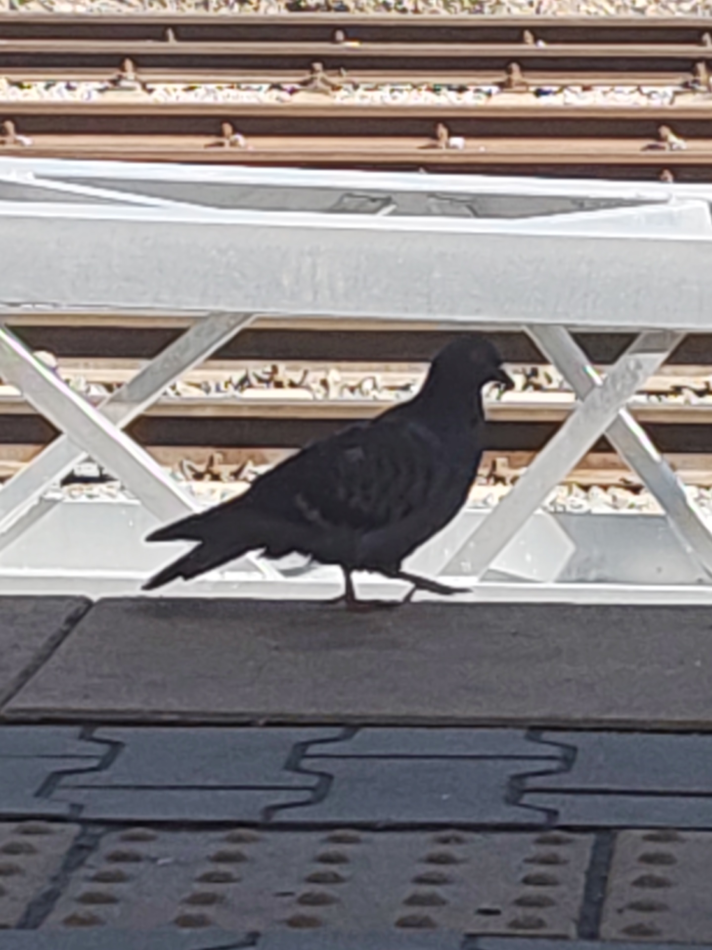 A pigeon, dark in color, is standing on a gray tiled surface. Behind the pigeon is a white structure with an "X" support design and tracks, partially obscured, are in the background. The location is indeterminate but is potentially in Sofia, Bulgaria.