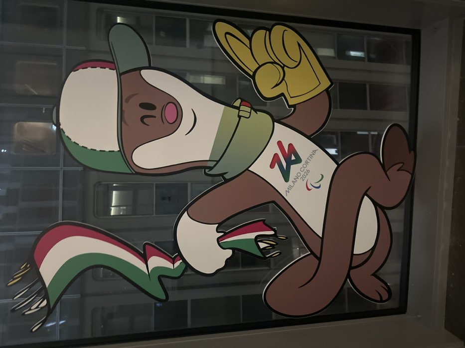 A cartoon depiction of an animal wearing a hat and a scarf with colors resembling the Italian flag. The animal has brown fur on parts of its body and is wearing a white vest with the text "MILANO CORTINA 2026" and a Paralympic symbol. The animal is giving a thumbs-up with a yellow-gloved hand. The image is most likely a promotional graphic or mascot.