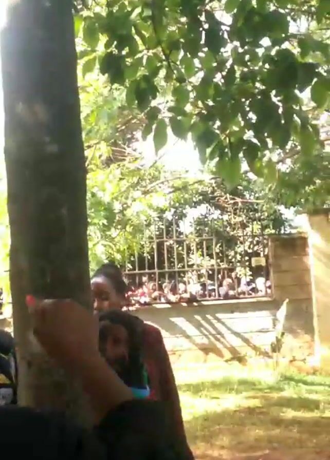In a park-like setting with trees and grass, several people stand behind a tree. A woman with dark hair and a brown jacket stands next to the tree, looking toward the right. A child is partially visible behind the tree, holding an Eritrean flag. To the left, a man wearing a black cap and a jacket is also visible. In the background, a stone wall with a black metal fence runs along the edge of the property, and a crowd of people can be seen behind it. The day is sunny and bright, with light filtering through the leaves of the trees.
