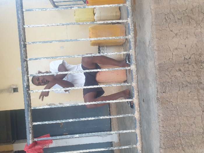 A single adult male, approximately 20-30 years old, with dark skin and short dark hair, is seated behind a set of weathered metal railings