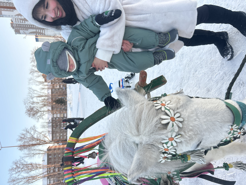 A woman in a white coat holds a child in a green snowsuit while riding a white pony decorated with daisies. They are on snow. Buildings and bare trees are in the background under a bright sky. The pony's harness is adorned with colorful ribbons. The child's mittens have writing on them. The woman is smiling at the child.