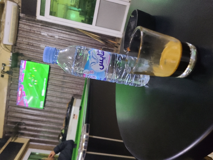 This image depicts the interior of a commercial establishment, likely a cafe or billiards hall, characteristic of those found in Fez, Morocco. In the immediate foreground, a round, black table is visible. On this table sits a clear plastic bottle of Ain Saiss mineral water, approximately half full, with a light blue screw cap. To its right, a clear glass contains a shot of espresso with a distinct layer of crema on top. Behind the espresso glass, a black ashtray, partially obscured, is present. In the midground, to the left, a green-felted billiard or pool table is positioned. A person, whose upper body is partially visible from behind, wearing a dark jacket, is seated or standing near this table, with their left arm resting on its edge. The background features a wall-mounted flat-screen television displaying a live football (soccer) match on a green pitch, with players in yellow and purple kits visible. The wall behind the television and billiard table is covered in vertical, light brown striped paneling or wallpaper. An air conditioning unit is mounted high on this wall, above the television. To the far right, a white doorframe with a translucent or frosted glass panel reflects a green hue, and several wooden billiard cues are propped vertically against the wall adjacent to it.