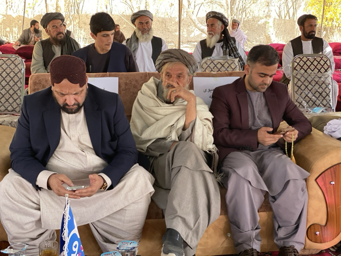 A group of Afghan men are seated on a low couch. The man on the left wears a maroon hat and a navy blazer, occupied with his phone. In the middle, an elderly man with a gray shawl is deep in thought. A younger man on the right, clad in a burgundy blazer, looks at his phone while holding prayer beads. Other men in traditional attire sit in the background, some wearing turbans. There are glasses and a flag on the table in front of them. The scene appears to be an outdoor event or meeting.