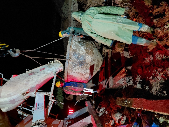 A dimly lit construction scene unfolds at night. A crane suspends a large, filled concrete bucket. Two workers in yellow hard hats appear to be guiding the bucket's contents. A third person, clad in a green raincoat and blue pants, stands near a dirt embankment. Debris and what looks like red-tinged mud are scattered around the lower right side of the frame.