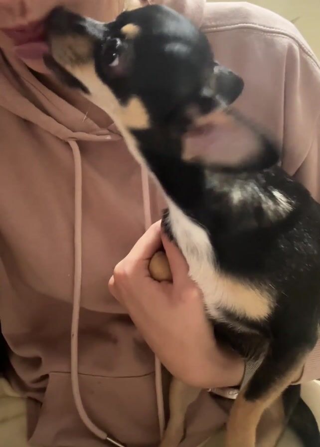 A young woman in a rose-colored hooded sweatshirt sits, holding a small, short-haired dog in her arms. The dog, predominantly black with tan markings on its muzzle and legs, is actively licking the woman's face around her mouth and nose. The woman is smiling and appears to be enjoying the interaction. The background is soft and out of focus, suggesting an indoor setting.
