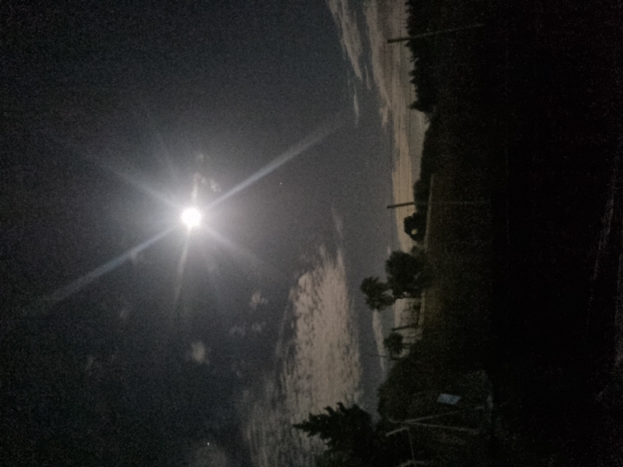 A nighttime outdoor scene is depicted, illuminated primarily by a full-appearing moon positioned in the upper central portion, exhibiting a prominent lens flare with visible rays. The sky is dark, featuring scattered, illuminated cloud formations. The location is in the city of Unknown, Unknown. In the foreground and midground, dense, dark vegetation covers undulating terrain. A conifer-like tree is visible on the far left. A chain-link fence or wire structure is partially present on the left, with a light-colored rectangular object (possibly a sign) attached. Several indistinct tree silhouettes, including some appearing to be palm trees, rise above the vegetation in the midground. Sparse, dark vertical posts are also visible within the vegetative areas. The horizon line features a lighter band of sky above distant, dark foliage. No individuals, specific actions, or interactions are discernible.
