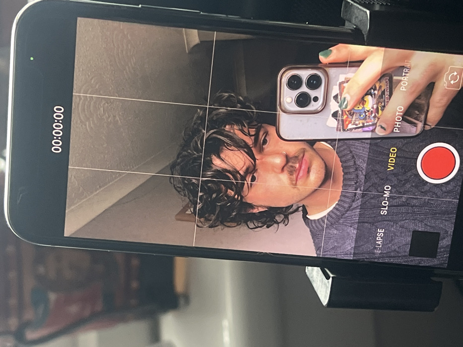 A dark-colored smartphone, likely an iPhone, is depicted vertically within a black mount or stand, in an indoor setting. Its screen displays the camera application interface, currently set to "VIDEO" mode with a timer showing "00:00:00" and a prominent red record button. The screen captures a reflection from a mirror. The reflection prominently features a male individual, appearing to be in his 20s or 30s, with dark, curly, medium-length hair and a mustache. He is wearing a dark grey or blue cable-knit sweater over a white crew-neck shirt. He has a small ring piercing in his left nostril and an earring in his left earlobe. His eyes are directed towards the reflected camera. In the lower right section of the reflection, a hand with green-painted fingernails is visible, holding a second smartphone. This device also appears to be an iPhone, featuring a triple camera array on its back, enclosed in a light-colored case adorned with multiple colorful stickers, including one resembling a collectible card. The background within the reflection shows a light-colored, textured wall and a partial architectural feature. Outside the primary phone's screen, in the upper left, a blurry, dark red object, possibly furniture, is discernible. The overall scene is located in the city of Unknown, Unknown.