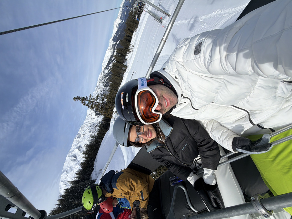 The image captures four individuals ascending a snowy mountain on a ski lift near Les Allues, France, under a clear blue sky