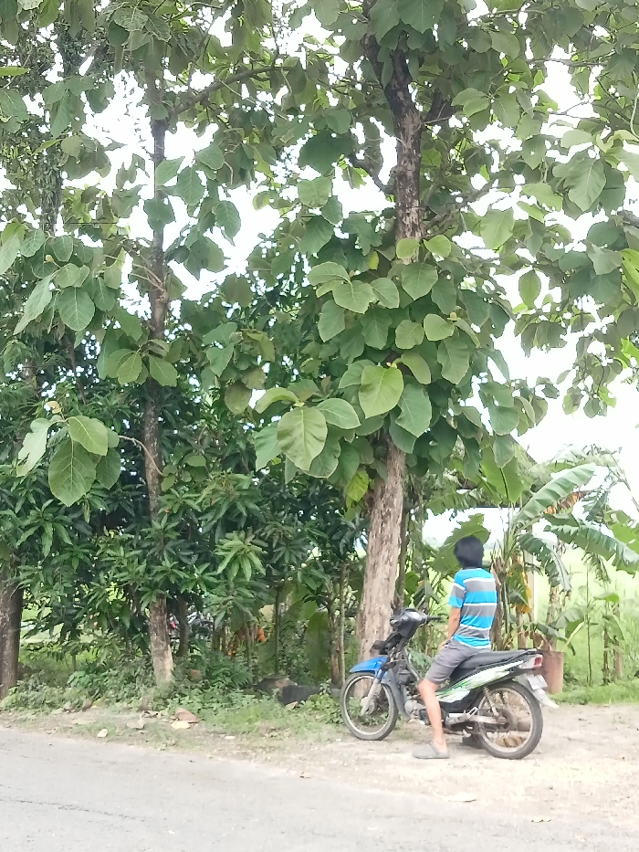 A young man sits on a blue scooter, parked on a dirt shoulder next to a paved road. He faces away from the camera, wearing a striped shirt and shorts. Lush green trees with broad leaves fill the background. Banana trees and dense vegetation grow behind the scooter. The setting suggests a rural or tropical location.