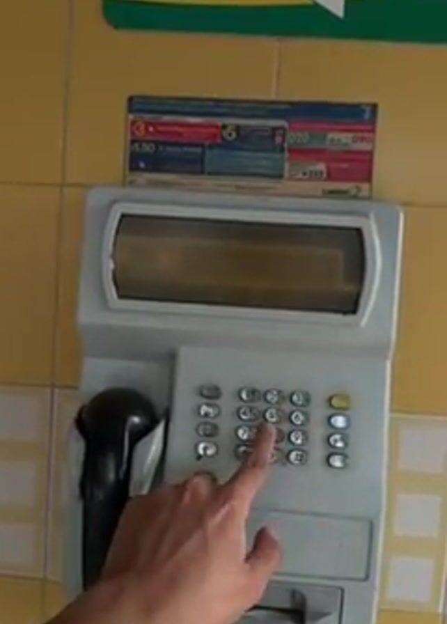 A person's hand is shown dialing a number on a public payphone. The payphone is a light gray color with a black handset. The keypad has standard numbers, and the hand presses the keys one at a time. The phone is mounted on a yellow tile wall. Above the phone is a sign with call rates and an arrow pointing left with the words "Los Cafetos." The video focuses on the phone and the hand interacting with it, with no other people visible.