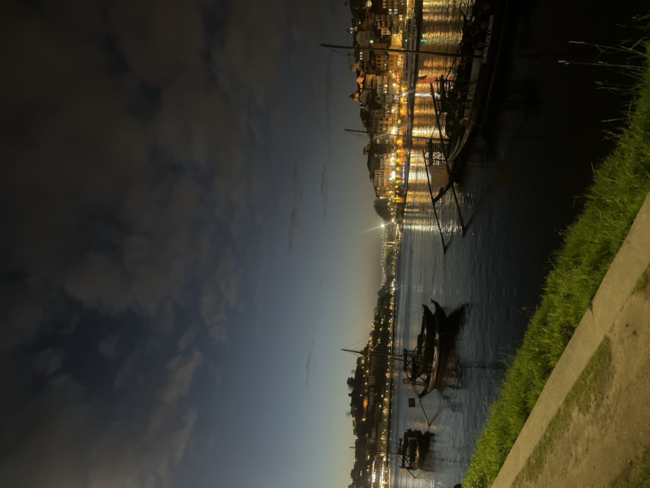 Illuminated buildings line a dark river at night. Several boats, including one with visible text, sit on the water's surface, reflecting the city's golden lights. A bridge can be seen in the distance, partially obscured by the glow. The sky is a mix of dark blues and grays, with a hint of clouds. A strip of grass and concrete is in the foreground.