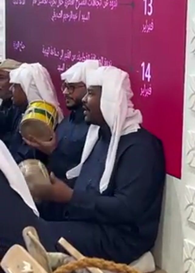 several men, one of whom is playing a small drum, while sitting on the floor at an indoor event. The men are all wearing similar traditional clothing consisting of a dark robe and a white head covering. The man playing the drum smiles as he plays. In front of them are various tools and nautical items. In the background is a pink wall with text in Arabic and the dates February 13 and 14. The overall atmosphere appears cultural and celebratory.