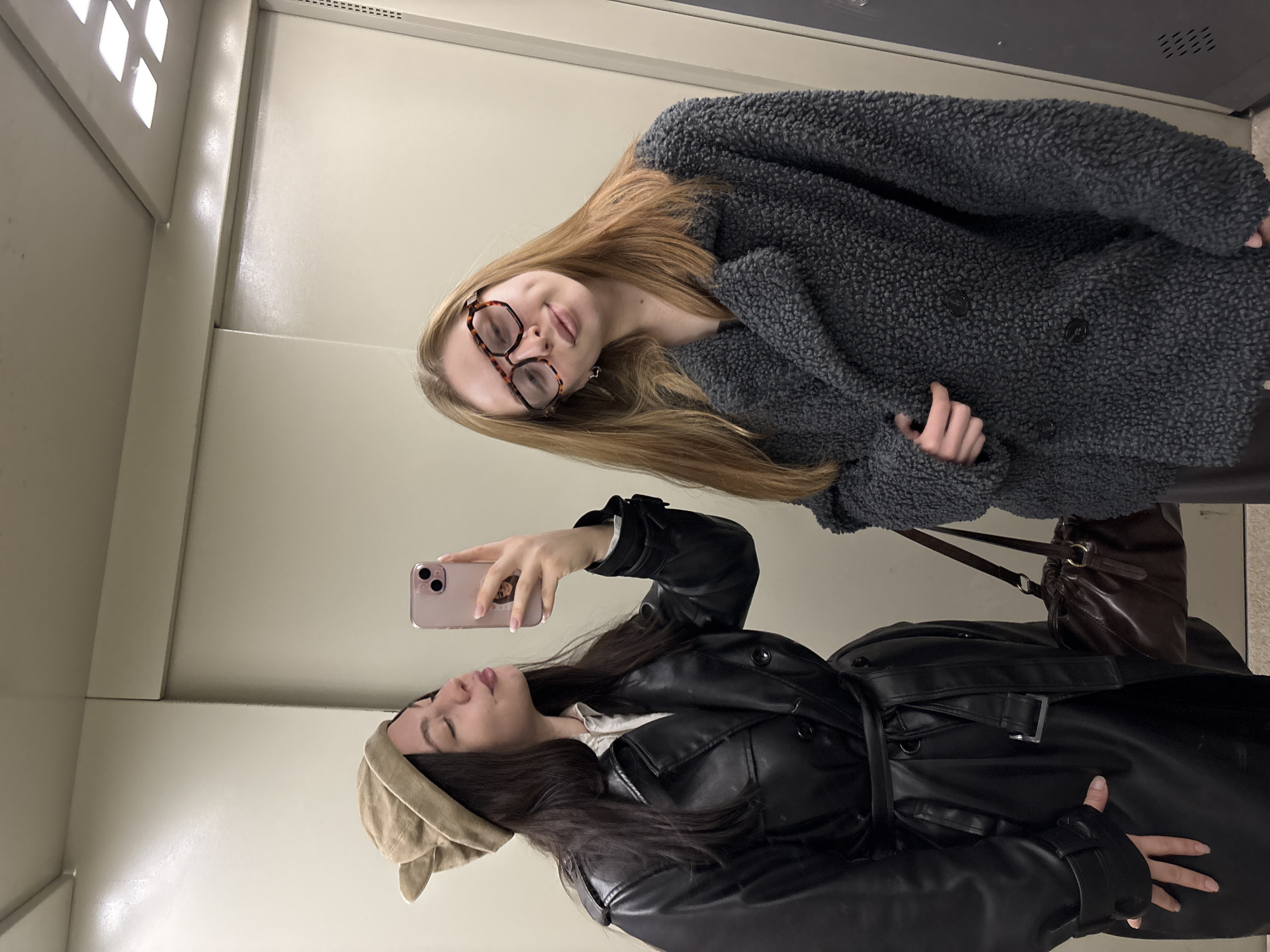 Two young women are depicted in an indoor mirror selfie, likely within an elevator or a room with a large reflective surface. The specific location within Perm, Russia, cannot be determined from the image, as the environment consists of generic light beige walls and a mirrored surface. The woman on the left has long, dark hair and wears a tan beanie with ear-like protrusions. She is dressed in a white collared shirt under a black, belted faux leather trench coat. She holds a rose gold smartphone with her right hand, directing it towards the mirror, and has her lips pursed in a pouting expression with eyes closed. A dark brown, drawstring-closure handbag with gold hardware is slung over her left shoulder. The woman on the right has long, straight, light brown hair and wears large, multi-sided tortoise-shell rimmed glasses. She is wearing a dark gray, textured, fuzzy-material coat with a wide collar and dark buttons. She holds her right hand near the coat's lapel and exhibits a subtle smile with her head slightly tilted. Her left hand is not clearly visible. The ceiling above features square recessed light fixtures, and a dark gray vertical panel is partially visible on the far right of the scene.