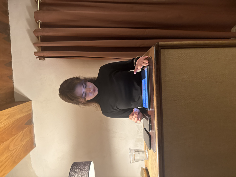A woman in a black turtleneck is seated at a wooden desk, using a tablet. The tablet's screen is illuminated, displaying data. A phone, coaster, and glass of water sit on the desk beside the tablet. A lamp is visible in the lower left corner. Behind the woman is a beige wall with brown curtains, with wooden stairs in the background. A large brown speaker is visible to the right of the woman.