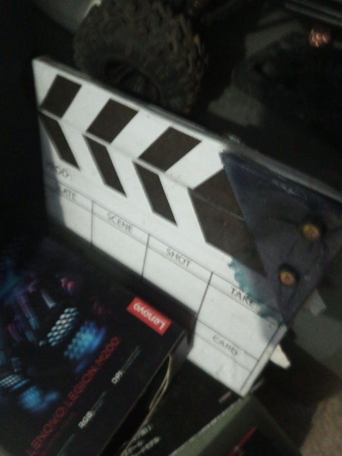 The image displays a cluttered indoor scene in B. Nam Ngao, Laos, captured from an overhead perspective under dim lighting, resulting in partial blur. The primary subject is a white film clapperboard positioned centrally and angled, showing black and white chevron stripes at the top. The body of the clapperboard is white with black grid lines and labels for "PROD," "DATE," "SCENE," "SHOT," "TAKE," and "CARD." A small, irregular blue-green stain is visible on the clapperboard near the "TAKE" section. To the left and below the clapperboard, a dark product box with a red "Lenovo" logo and white text "LENOVO LEGION M200" is partially visible. Additional text, "RGB" and "DPI," is also discernible on this box. In the upper right background, a dark, knobby rubber tire is partially visible, indicating a vehicle or large wheeled object. No individuals are present or engaged in any discernible action.