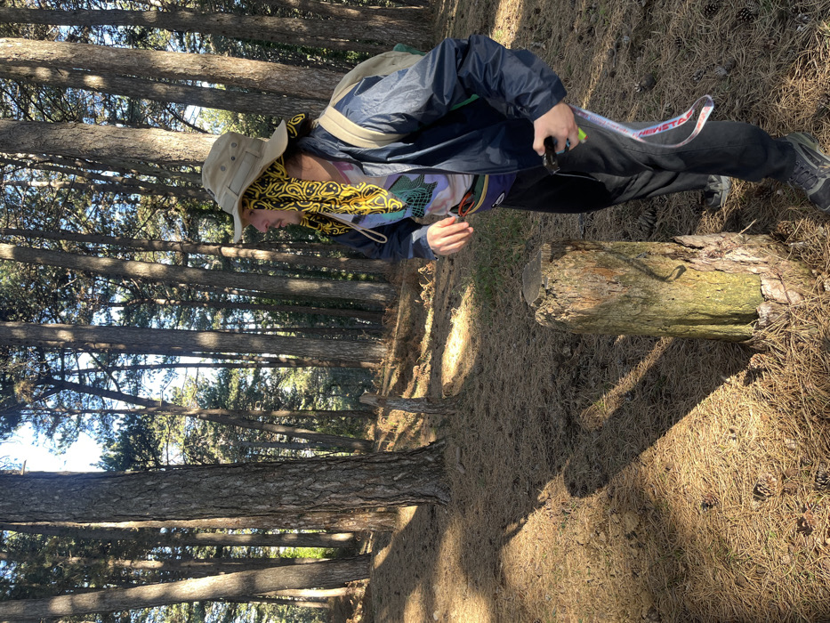 The image displays a single male individual standing within a sunlit pine forest environment in Škaljari, Montenegro. The ground is covered with a dense layer of dry pine needles and scattered pinecones. The individual, positioned slightly right of the frame's center, is oriented to the right, looking forward. He wears a beige wide-brimmed hat with a yellow and black patterned fabric extending from beneath it to cover his ears and neck. His attire includes a dark blue lightweight jacket over a multi-colored, patterned t-shirt, dark pants, and dark athletic shoes. A light-colored backpack is worn on his back, and a multi-colored fanny pack is secured around his waist. In his left hand, he holds a dark, rectangular object, possibly a mobile device, pointed downwards. A multi-colored lanyard, bearing the text "NEW STAR," hangs from his left side. A weathered tree stump, approximately 0.6 meters in height, stands in the foreground to the left of the individual, exhibiting visible bark texture and some green growth on its side. Numerous tall, slender pine trees with distinct trunks fill the background and midground, casting elongated shadows across the forest floor from sunlight originating from the upper right. A smaller, broken wooden post is visible in the midground behind the stump.
