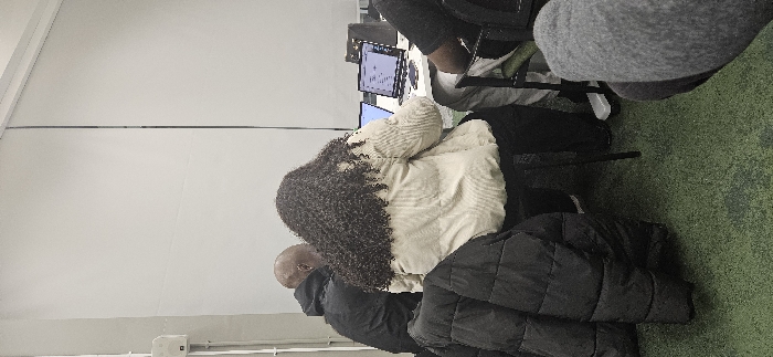 Several individuals are seated, facing computer screens displaying what appears to be stock market data or graphs. Most are wearing casual clothing, including jackets and hoodies. The room has a neutral color scheme with white walls, and the floor is covered in green carpeting. Multiple personal belongings, such as bags and coats, are placed on or around the chairs.