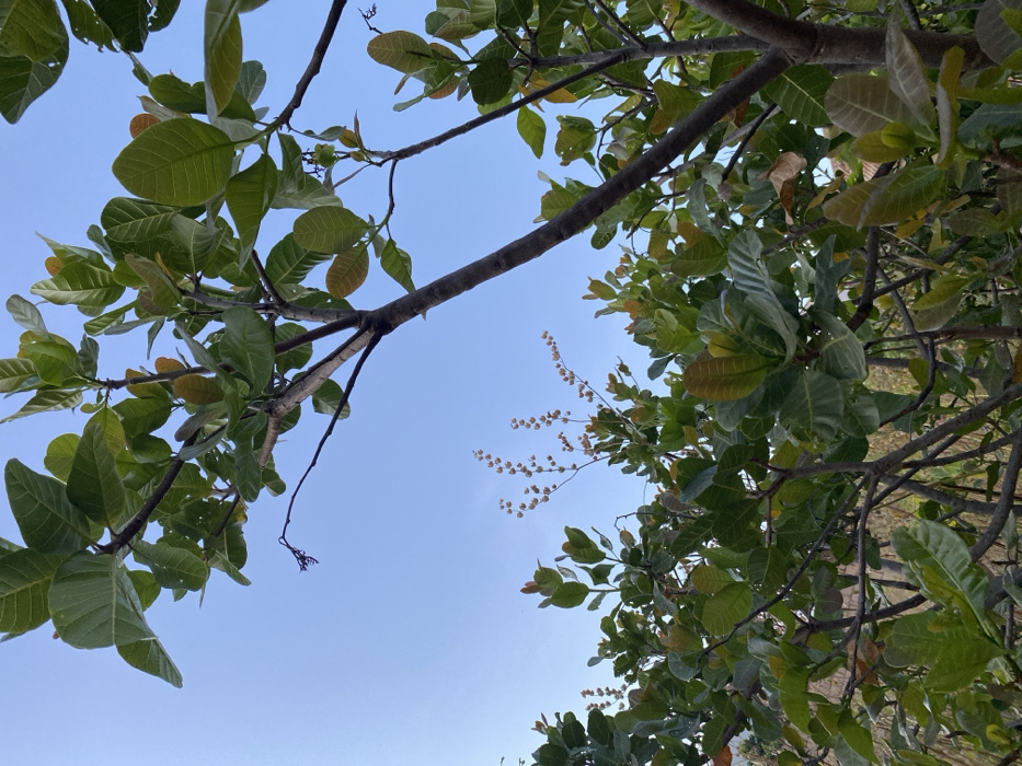 The image displays a dense canopy of green foliage against a clear, light blue sky in Udu, Nigeria. The foreground and mid-ground are dominated by the branches and large, ovate leaves of what appears to be a cashew tree, with mature leaves in varying shades of dark green and younger leaves exhibiting lighter green and reddish-brown hues. A prominent, dark-barked branch extends diagonally from the lower right towards the upper left. In the mid-ground, a separate plant type is visible, characterized by delicate, slender stems bearing numerous small, pale, clustered structures, possibly inflorescences or seed pods. No individuals, animals, or man-made structures are discernible within the frame.
