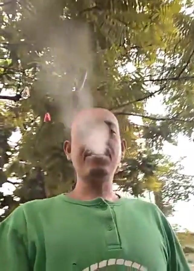 A man is seen outdoors, wearing a green shirt, under a leafy tree. He is exhaling smoke from his mouth. In the background, a building is partially visible, and the sun shines through the tree branches. A faint sound of a rooster crowing can be heard.