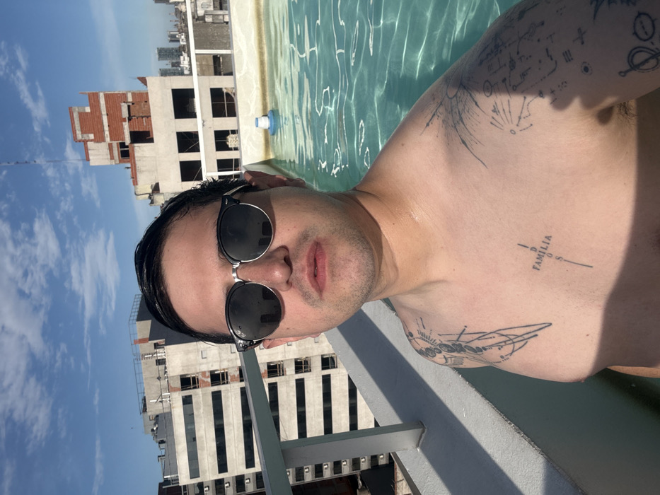 A man with sunglasses is taking a selfie in what appears to be a rooftop pool. He is shirtless, revealing several tattoos on his chest and arm. The water is clear and reflects the bright sunlight. In the background, buildings are visible, some under construction, against a blue sky. The photo is rotated, presenting a slightly disorienting perspective.
