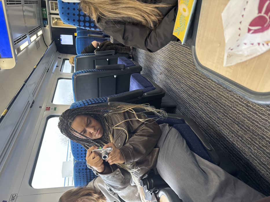 This image depicts the interior of a train carriage, identified as being in or near North Ferriby, United Kingdom. A young female is seated on the left, serving as the primary subject. She has dark hair styled in braids, with distinct blonde highlights woven into the lower sections. She wears a brown, leather-look jacket over grey trousers. Both hands are actively engaged with a silver compact digital camera, which has a green indicator light illuminated. Her facial expression appears focused or strained. To her immediate left, another individual with light brown hair and a grey hooded sweatshirt is partially visible. A black water bottle rests on the small table surface beside the primary subject. The train interior features rows of blue patterned seats with grey plastic seatbacks. Overhead, linear fluorescent light fixtures illuminate the carriage, which also includes overhead luggage racks. Large rectangular windows line the upper section, revealing an overcast sky and indistinct exterior elements. Internal signage includes a "WC" indicator above a door and an "Exit" sign with an arrow. A blue digital display screen is mounted overhead in the aisle. Further down the aisle, a person with blonde hair is visible from behind, seated in a similar blue seat. In the immediate right foreground, the shoulder and long blonde hair of another seated individual are partially visible. On a light-colored table in the foreground, a yellow rectangular dish featuring a light blue and white floral pattern is present, alongside a crumpled white paper bag with a red design. The floor of the carriage is covered with a grey, vertically striped carpet. No direct interactions between individuals are discernible.