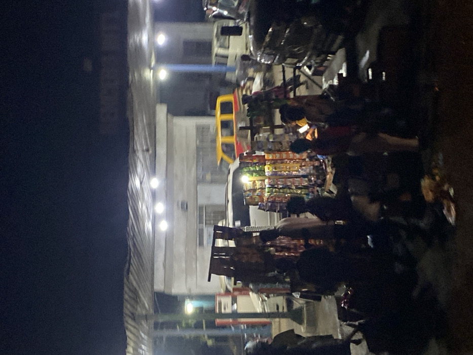 A night street scene shows a building illuminated by several lights, next to what appears to be a vendor stall overflowing with colorful packaged goods. People are gathered around the stall, possibly shopping. Parked vehicles are also visible, including a yellow and red vehicle and others behind the vendor. The overall scene is somewhat dark and blurry.