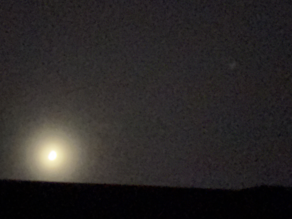 - "A dim, hazy moon is partially visible near the lower left horizon" by FM-Vky7v2, licensed under CC BY 4.0