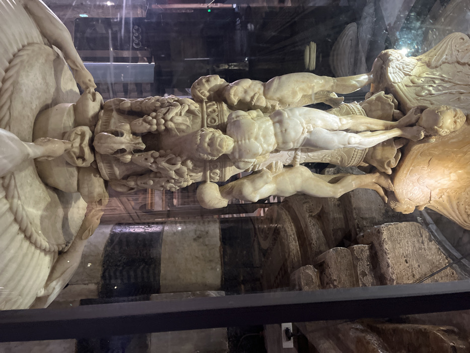 This image features a multi-tiered, white marble font located in the Baptistery of San Giovanni, adjacent to the Siena Cathedral in Siena, Italy. The font's central support column is adorned with four nude male figures, depicted as atlantes, holding an upper basin. These figures exhibit detailed musculature and individual facial features. Carved garlands and grotesque masks, including animal skulls, decorate the column above the figures. The base displays organic, wave-like forms and a single carved putto head. The sculpture is viewed through a reflective barrier, with architectural elements, specifically horizontally striped black and white marble columns and patterned flooring, visible in the background and reflections.