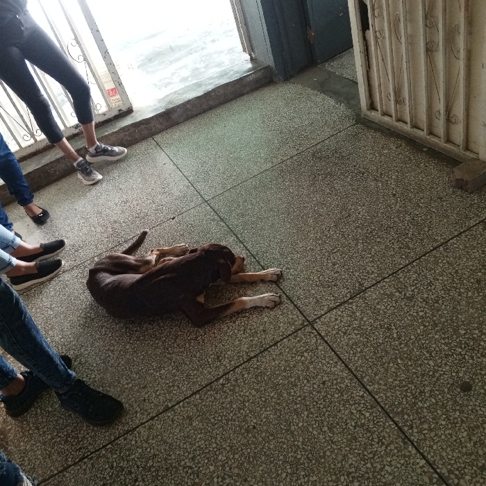 This image depicts an interior tiled area in Santa Ana, Venezuela, near an open doorway. A medium-sized, short-haired brown dog with lighter paws is curled up and resting on the light-colored, speckled terrazzo-style tiled floor in the center of the frame. Four individuals are visible from the knees or mid-calf down. On the far left, one person wears dark blue jeans and black flat shoes. Near the doorway, a second person wears black leggings and grey athletic shoes. A third individual, at the lower left, wears dark blue jeans and black athletic shoes. The feet of a fourth person, wearing black flat shoes, are partially visible behind the first person's feet. The doorway leads to a brightly lit exterior, with a raised concrete threshold and a light-colored metal gate or barrier partially visible on the right side of the opening. The dog is still; the individuals are standing.