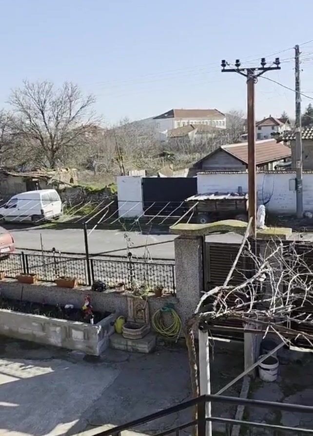 daytime view from a balcony overlooking a residential street. Across the street are houses with white fences. A black metal gate marks the entrance to one property. Overhead are power lines strung between utility poles. In the foreground, the balcony has a black metal railing and a weathered wooden surface. A dead vine climbs the metal structure. The sky is clear and blue.