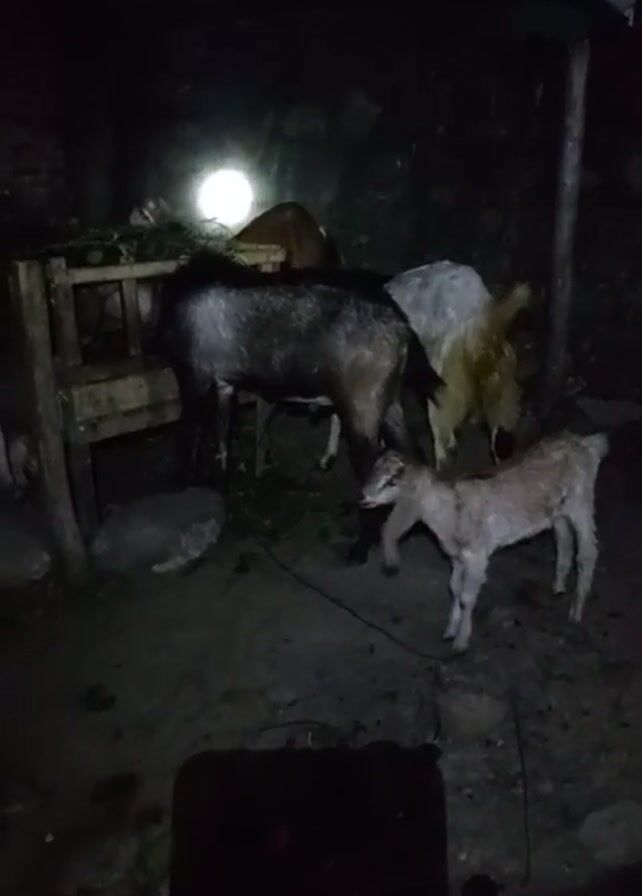 group of goats in an enclosure. The scene is dimly lit by a single light source. There are at least five goats of different colors, including gray, brown, white, and black and white. They are standing and eating from a wooden feeder. The enclosure appears to be made of concrete and brick.