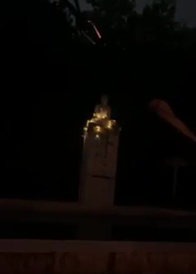 In the darkness of night, the camera focuses on a small, seated statue atop a light-colored pillar. The statue is adorned with small, warm-toned fairy lights, which provide the primary illumination, making the statue and pillar visible. The surrounding environment is dark, with glimpses of trees and possibly power lines or branches silhouetted against the night sky. To the right, there is the suggestion of a structure or object partially visible in the darkness. The shot is steady, with no apparent movement in the camera's position. The scene exudes a serene and tranquil atmosphere, highlighted by the soft glow of the fairy lights.