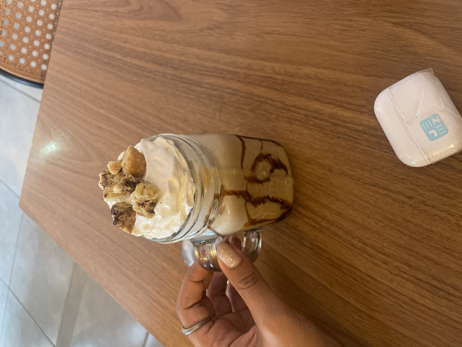 An image captured from a high-angle perspective shows a person's hand holding a drink in a cafe setting in Anápolis, Brazil. The primary subject is a clear glass mason jar containing a light brown, blended beverage, likely a milkshake or iced coffee, with dark brown syrup streaks adhering to the interior walls of the jar. The drink is topped with a generous portion of white whipped cream, further garnished with irregular pieces of light brown and dark brown cookie crumbles. A human hand, with light skin tone and fingernails painted with a shimmering light polish, is holding the handle of the mason jar. A plain silver-colored ring is visible on the ring finger. To the lower right of the jar, a white Apple AirPods charging case is resting on the table. The case features a light blue sticker or logo with stylized letters, possibly "JZM," on its surface. The objects are positioned on a light-colored wooden table, exhibiting a visible wood grain pattern. The background is partially blurred, revealing a light-colored floor or wall section in the upper left, and a portion of a chair with a cane or wicker backrest in the upper right. The scene is illuminated by ambient indoor lighting.