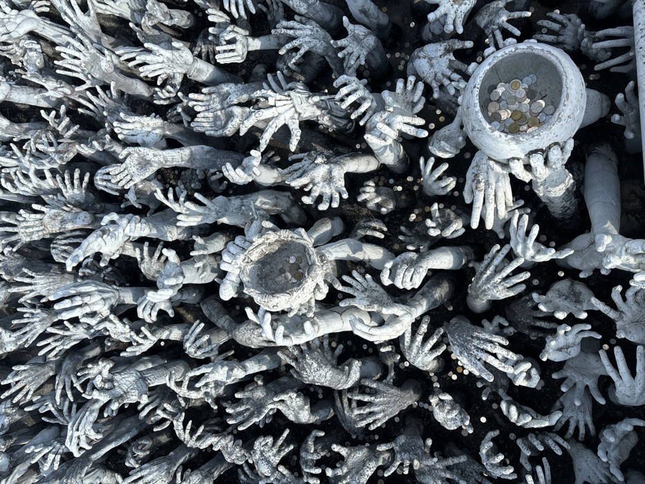 - "The image displays a dense array of sculptural hands emerging from dark ground, located in Ban Rong Khun, Thailand, at the Wat Rong Khun (White Temple)" by FM-bmo3E3, licensed under CC BY 4.0