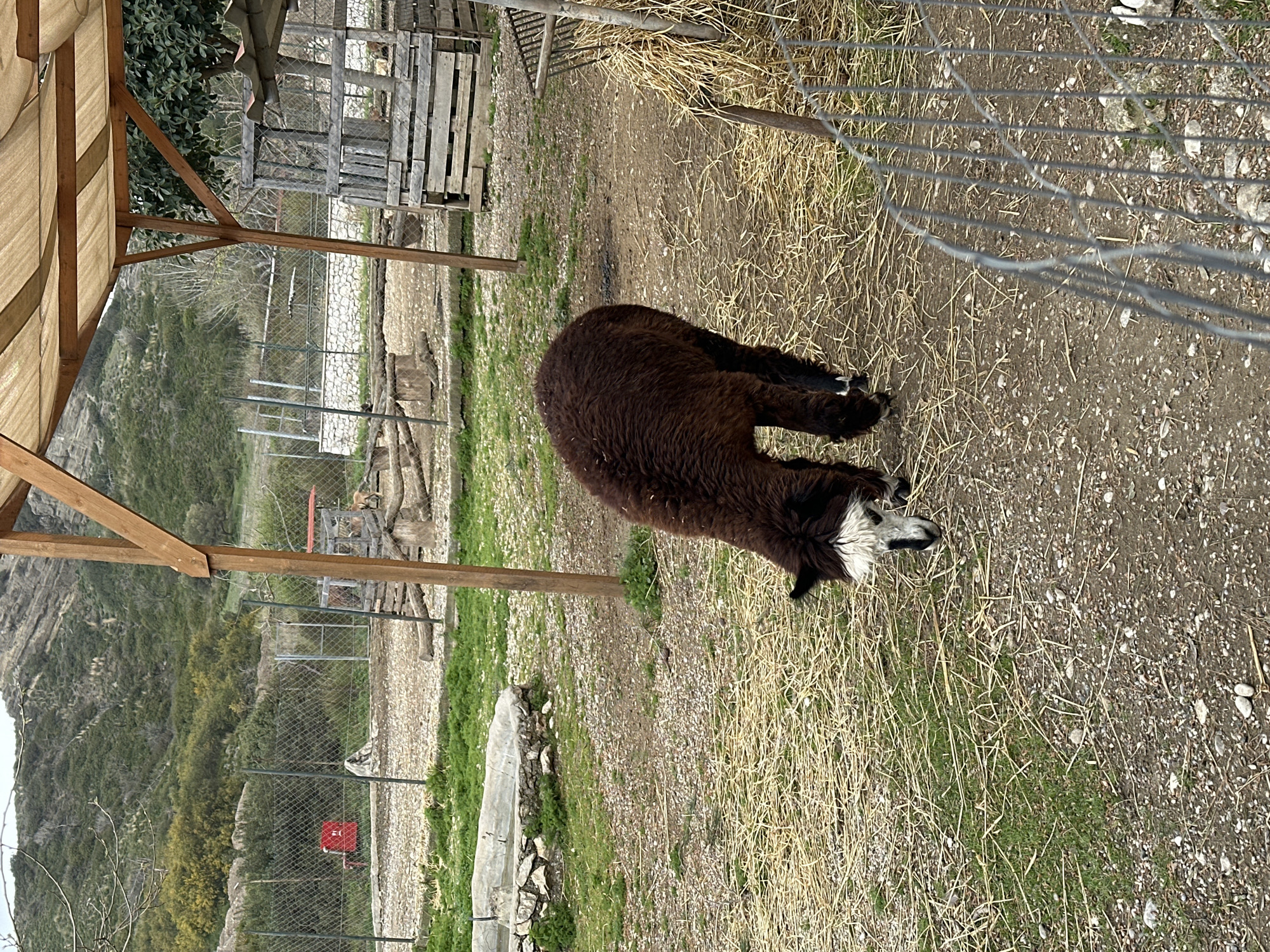 n alpaca standing in a rural enclosure. The alpaca has dark brown fur, except for its head, which is white. The enclosure consists of dirt and some grass, along with hay. In the background, there is a wire fence, trees, and a hillside. A wooden structure partially covers the left side of the frame. The location is Unknown, Greece.