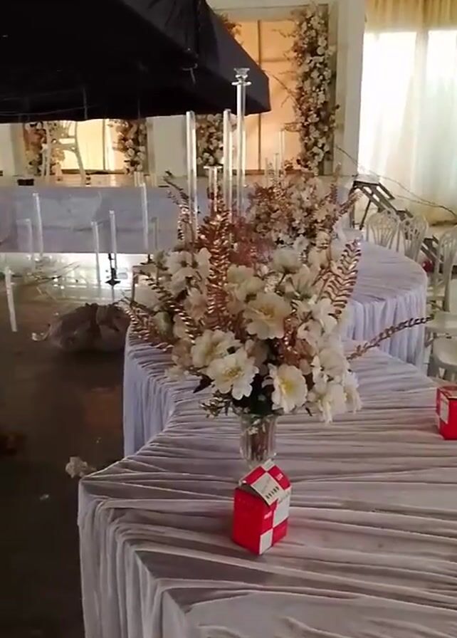 aftermath of a possible event. The scene is a large indoor space that appears to be a banquet hall or event venue, with tables draped in white cloths and floral arrangements on them. However, the room is in disarray. Debris, including scraps of material and floral fragments, are scattered across the floor. There are also overturned tables and what appears to be remnants of decorations. The overall impression is that the space was once set up for an event, but something has occurred to disrupt it, leaving it in a state of chaos. There are no people visible in the video. The lighting appears to be bright.