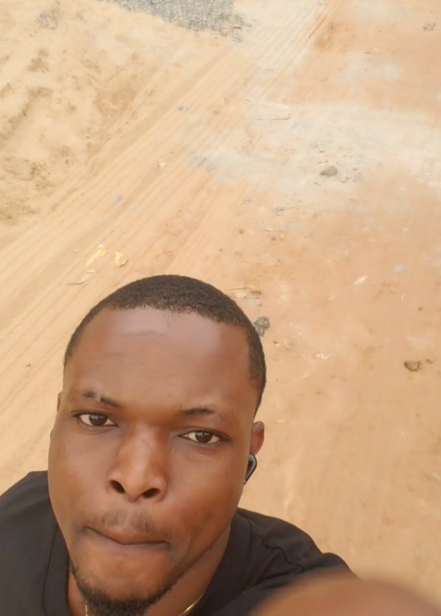 A medium close-up vertical shot shows a Black man wearing a black T-shirt and gold cross necklace standing on a beige sandy surface. In the background, there is gravel and what appears to be a partially constructed or dilapidated building. He looks directly at the camera and touches his forehead and face with his hand. He is also wearing a turquoise wrist watch.