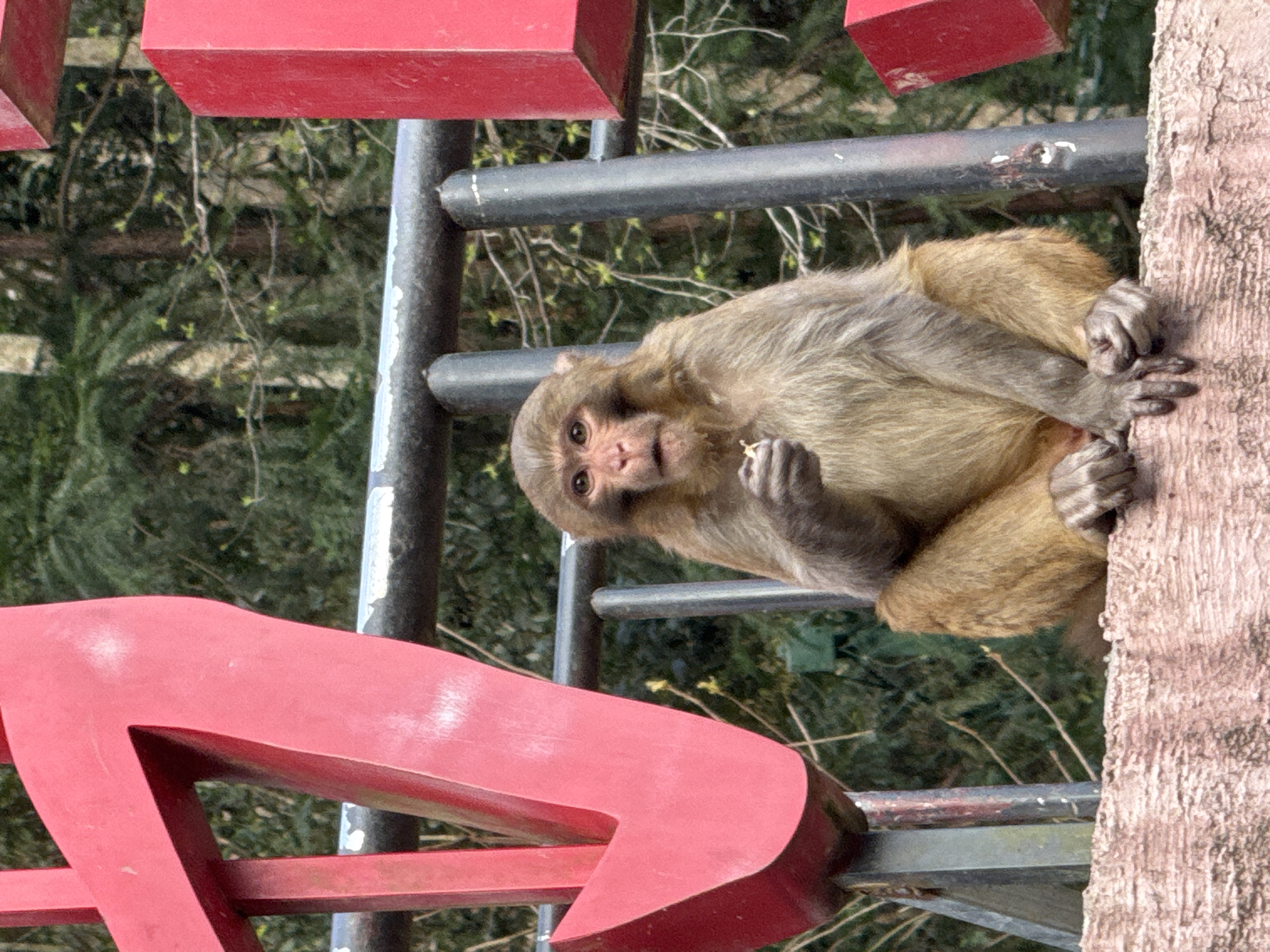 A macaque monkey is seated on a textured, reddish-brown ledge in Wulingyuan, China. The monkey, with brown and gray fur, faces forward, looking directly towards the viewer with its mouth slightly agape. It holds a small, light-colored food item in its right hand, positioned near its mouth, indicating an action of eating or about to eat. Behind the monkey, a structure of dark gray metal bars forms a railing or fence. Large, three-dimensional red sculptural elements, possibly part of signage or a decorative installation, are visible on either side of the monkey; a curved segment appears on the left, and an angular block on the right. The background consists of dense green foliage and tree trunks, indicating a natural, forested environment.