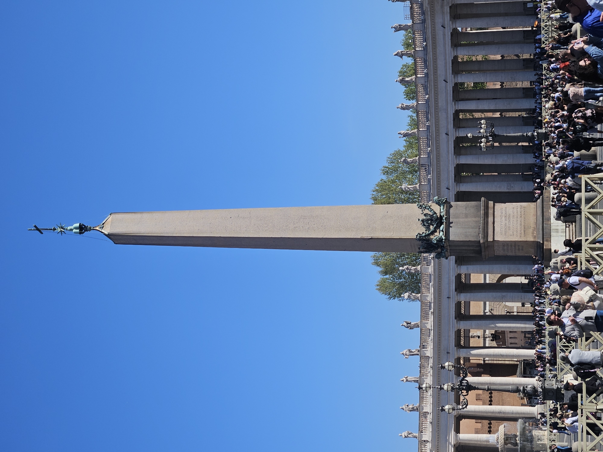The image depicts St. Peter's Square in Vatican City, with the Vatican Obelisk prominently featured. The obelisk is a tall, ancient Egyptian monument topped with a cross and is the focal point of the square. To the right, are the colonnades of St. Peter's Basilica, adorned with statues and a throng of tourists milling about. The sky is a clear, bright blue. The columns create a covered walkway populated with people, some of whom are standing near a barrier. The photo appears to be taken on a sunny day, and the environment is full of architectural details and a large number of people.